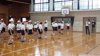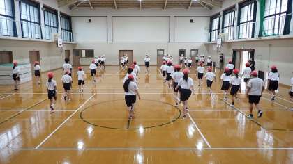 体育館でたて・よこの列を揃え,カウントに合わせて足踏みをしたり行進をしたりする活動に取り組んでいます。拍がバラバラにならないように気を付けて練習していました。