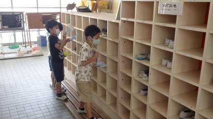 1年生が,学習が終わってから掃除をしています。教室の掃き掃除や,みんなの使うくつ箱の砂の清掃など,隅々までていねいに取り組んでいます。