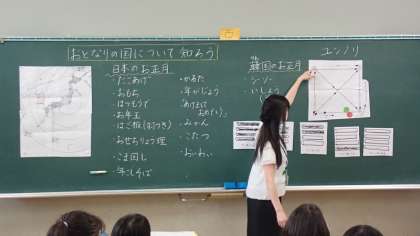 3年生は,学級活動で「おとなりの国を知ろう」の学習に取り組みました。絵本を読んで,日本と韓国のお正月のちがいを考え,絵本にある遊びの「ユンノリ」をして,韓国の文化に親しむことができました。