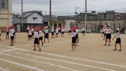 3・4年生は,体育の時間に「乾隆スポーツフェスティバル」で披露する演技の練習をしています。ひとつひとつの動きを確かめたり,運動場での立ち位置を確かめたりしながら練習をしていました。