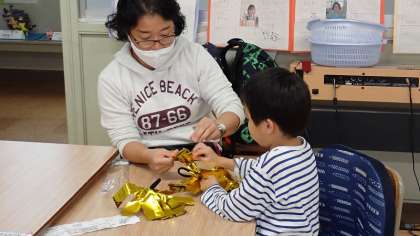 コスモス学級では,「乾隆スポーツフェスティバル」で使うポンポンや,図工のお面づくりに取り組んでいます。みんな,ていねいに作品づくりを進めています。