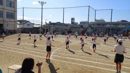 まずは,1・2年生の部です。運動場に整列して,開会式をしました。係の6年生が開会式を進行しました。そのあと,みんなで全校ダンスを踊って準備運動はばっちりです。