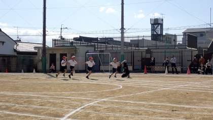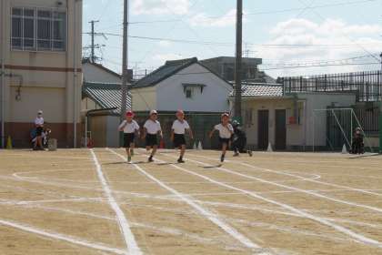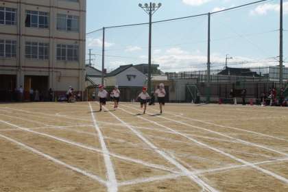 はじめの競技は,1年生の50m走です。まっすぐ先のゴールめざして,一生懸命走り切りました。