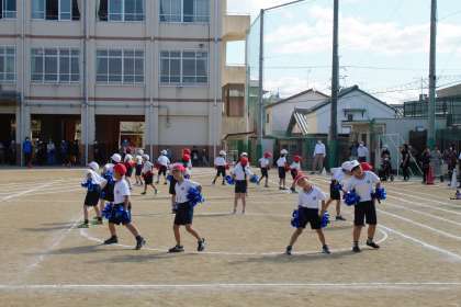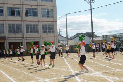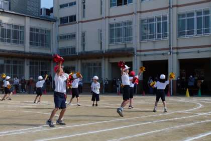 1・2年生の最後の種目は,団体演技のダンスです。いきものがかり『ジャンプ』に合わせて,リズムよく踊りました。手首につけたポンポンのように,きらきら輝く笑顔で踊る姿がとても素敵でした。