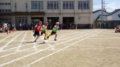 中学年の部最後の種目は,4年生のリレーです。磨き上げてきたバトンパスで,前のチームとの差を詰めていきます。最後まであきらめず,全力で走り切りました。