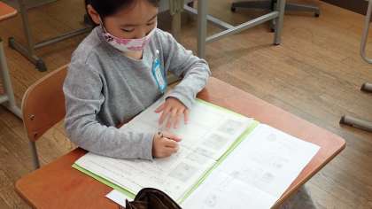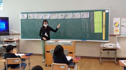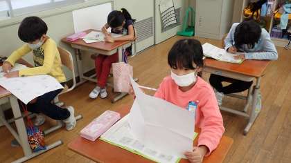 2年生は,国語の学習で「お手紙」を読んでいます。それぞれの場面で,「がまくん」と「かえるくん」が何をしている場面なのかを確かめながらプリントにまとめていました。