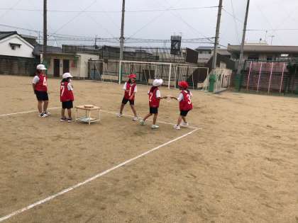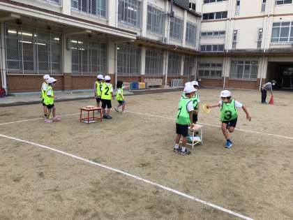スポーツフェスティバルでも楽しんでリレーを行なっていた子どもたちですが,今日の授業ではまた新しいリレーに挑戦しました。バトンゾーンを作り,その中でリングバトンを受け渡して走る折り返しリレーです。