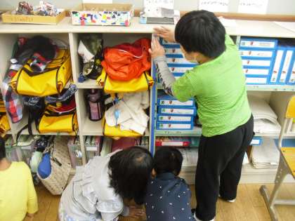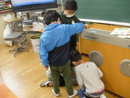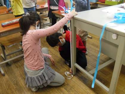 算数科の「おおきさくらべ」では,ロッカー・オルガン・先生机の高さをどうしたら比べられるかをみんなで話し合い,紙テープで比べました。