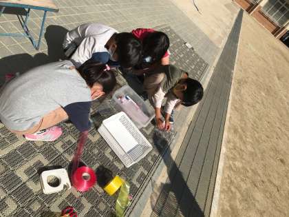 たまごパックやプリンカップなど透明で光を通すものを使って影でいろいろなものをうつしました。油性ペンやすずらんテープで色をつけると,影にも色が映ることに気付きました。