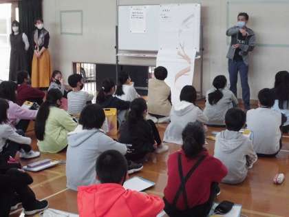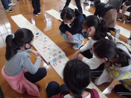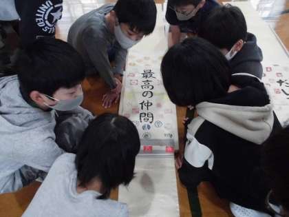 総合的な学習の時間に「幡の学習」がありました。今日は,卒業制作の一つである幡の図案を考えました。まずは,図案の説明をしてもらい,これまでの卒業生たちが作った幡を見ました。いろいろな図案があり,子どもたちは興味津々でした。