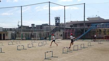 6年生は,体育の『ハードル走』の学習に取り組んでいます。4年生で学習したときのことを思い出し,『トン・1・2・3』のリズムで調子よく走ることに取り組んでいます。