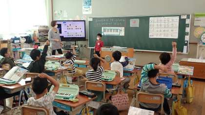 1年生は,音楽の学習に取り組んでいます。『ひのまる』を階名唱したり,『どんぐりさんのおうち』を鍵盤ハーモニカで演奏したりして,音楽に親しんでいます。