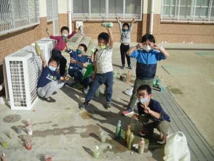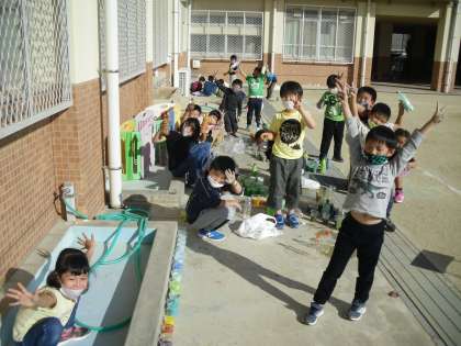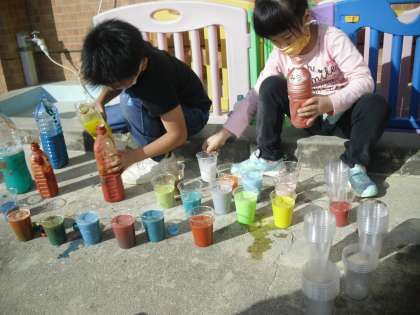 ペットボトルでシャバシャバと混ぜた色水を,コップにうつしかえて,似た色を並べたり,お店屋さんのようにしたりと色々な色の水をつくることを楽しんでいました。