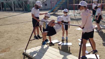 2年生は,体育の「てつぼうあそび」の学習に取り組んでいます。