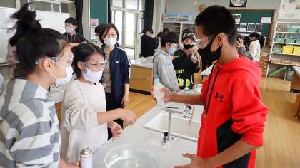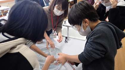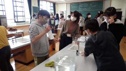 実験の仕方を確かめ,グループで実験をスタートしました。ペットボトルに二酸化炭素を入れるのに少し苦労しましたが,準備のできたグループからペットボトルを勢い良く振って,どんな結果になるかを確かめました。