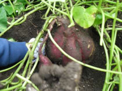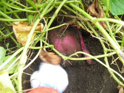 さつまいもを傷つけないように,つるの先をたどって丁寧に優しく掘り進める子ども達。思った以上に大きなさつまいもができていて,掘るのも一苦労でした。