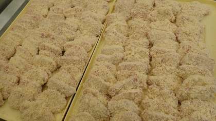 乾隆小学校では,2人の給食調理員さんが約170人分のとんかつに手作業でころもをつけ,ひとつひとつていねいに揚げてくださいました。