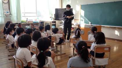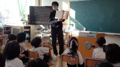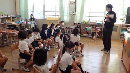 2年生の教室では,朝学習の時間に5年生の担任の先生が読み聞かせをしていました。