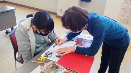 女性会のみなさんに教えていただきながら,ていねいに和紙をちぎって色紙に貼っていきます。