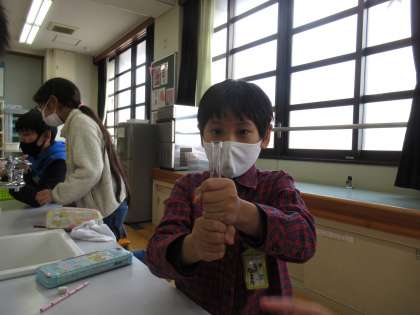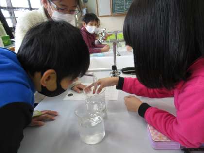 空のペットボトルにふたをして氷水に入れたり湯に入れたりすると,ペットボトルがへこんだり元に戻ったりしました。「温度が変わったから空気の体積が変化したのではないかな?」という予想をもとに,空気の温度と体積の関係を調べる実験を行いました。とても集中し,班の友だちと協力して取り組んでいました。