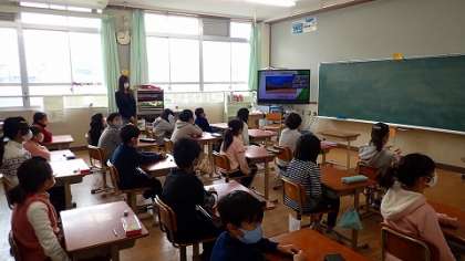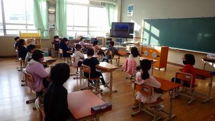 TV画面を通して行うことにも子どもたちはずいぶん慣れてきました。校長先生の呼びかけに手を振って返したり,返事をしたりしていました。