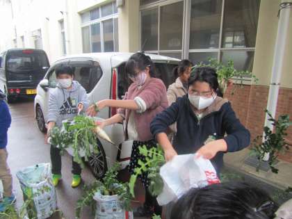 あいにくの雨でしたが,体育館の軒下で大根を抜きました。