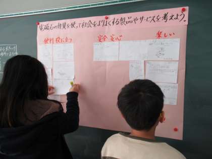 単元の学習のまとめとして,電磁石の性質を用いて社会をよりよくするためのアイディアを出し合いました。まず,社会をよりよくするというのは便利,役に立つ,安心・安全,楽しい,環境によいという観点があるという意見が挙がりました。各自,工夫したアイディアがたくさん出て,とても盛り上がりました。