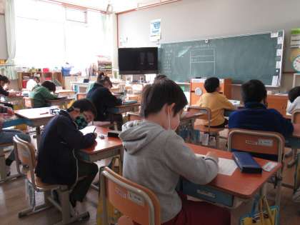 雪が降った日には雪で遊んだり,寒い日には畑で氷を見つけたり冷たい風を袋に集めたりしてきた1年生。今回は,寒い冬に昔から室内で楽しまれてきた遊びを体験してみました。