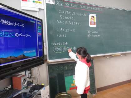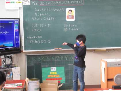 そこで今日の算数のめあて「32+5の計算のしかたを考えよう」をもとに,お金を使ったり数え棒を使ったり10と1を使って図をかいたり,自分なりの方法でよく考えていました。