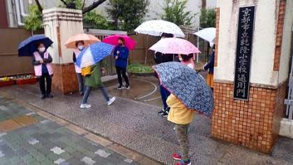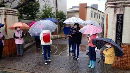 今日のあいさつ運動の担当は,たてわりグループの11,12班でした。雨が降るあいにくの朝でしたが,傘を差しながらがんばってくれました。