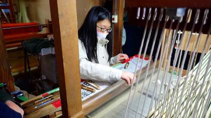 はじめにお手本を見せていただき,1人ずつ順番に体験しました。糸を変えながら幡を織り進めていきますが,なかなか思ったようにできず,難しさを実感していました。