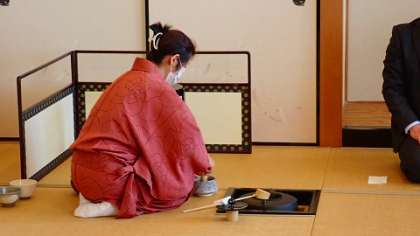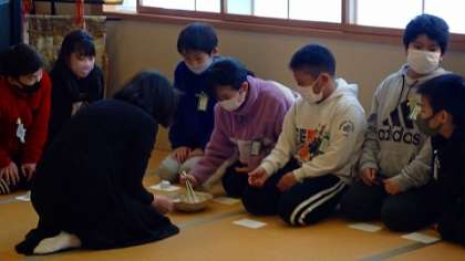いよいよ,お茶をいただきます。先生がお茶を点てられる様子を見せていただきました。また,お茶の前にいただくお菓子も順番に懐紙に取らせていただきました。