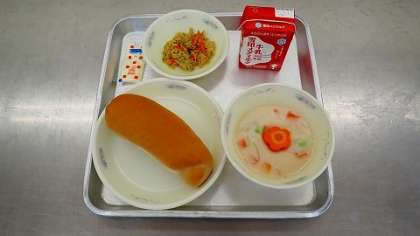 今日は,パンにはさんで食べるツナごぼうサンドでした。マヨネーズと混ぜて,カレー風味のサンドイッチを楽しんで食べました。