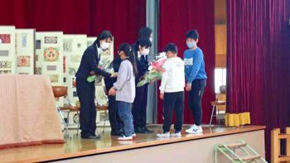 5年生の代表児童が,お礼とお別れの言葉を贈りました。最後に,花束をお渡しして離任される教職員のみなさんを見送りました。