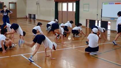 学年はじめの単元として,「体ほぐしの運動」をしています。今は,体を組み合ってするような活動は控えているので,体育館を軽くジョギングしたり,ストレッチをしたりしました。