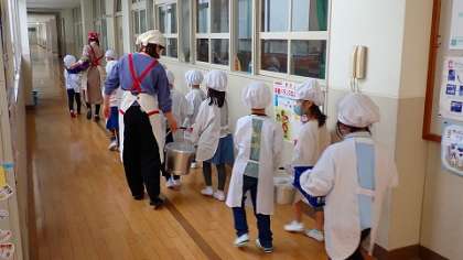 給食当番の子どもたちが,サービスホールに給食を受け取りに来ました。