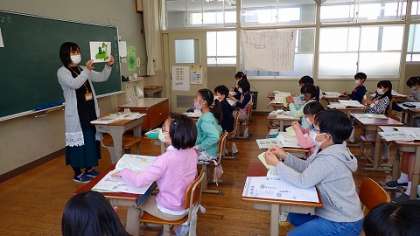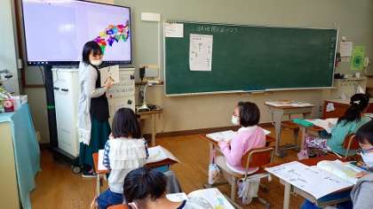 担任の先生が示す都道府県の形を見て,日本地図でどこにある都道府県かを探しています。全部で47もある都道府県ですが,しっかりと覚えてほしいと思います。
