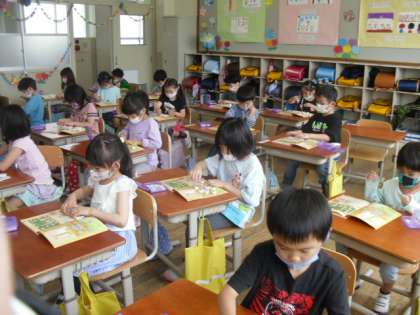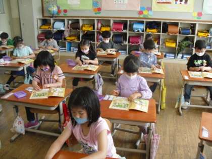 1年生の算数では,数図ブロックを使って,二つのものの集まりを対応させて数の多少を確かめました。真剣な表情で,ブロックを動かしていました。