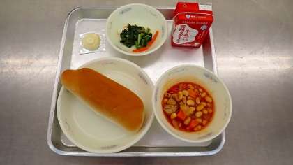 やわらかく煮られた鶏肉にトマト味がしっかり染みこんでいました。大豆も食べ応えたっぷりで,お腹いっぱいになりました。