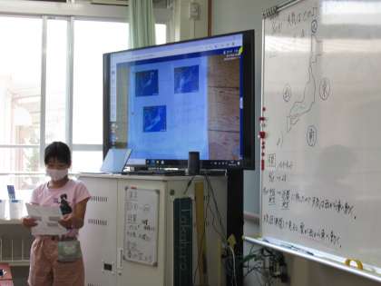 タブレットを使用して運動場から見える雲のようすを長期間記録したり,ゴールデンウィーク中には,天気がどのように動くのかを,インターネットや新聞から雲画像や雨量情報等の情報を収集したりしました。