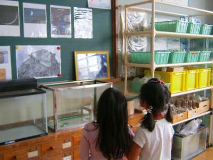 校内のいろいろな教室をグループで見て回ります。あまり行くことのない4階の多目的ホールや,3階の音楽室や理科室も探検します。