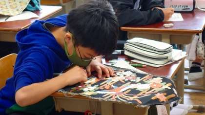 また,西陣織の実物も順にじっくり見させていただきました。細かい図柄に子どもたちも見入っていました。