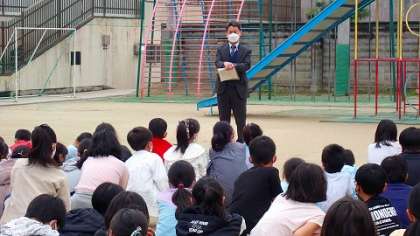 その後,「お・は・し・も・て」の約束を守って運動場に避難しました。全校児童が避難するのにかかった時間は,3分3秒でした。運動場では,安全主任の先生や校長先生のお話を聞きました。もしもの時に備えたよい訓練になりました。