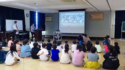 1年生の紹介の後は,各学年からの1年生への「おめでとうメッセージ」を見ました。