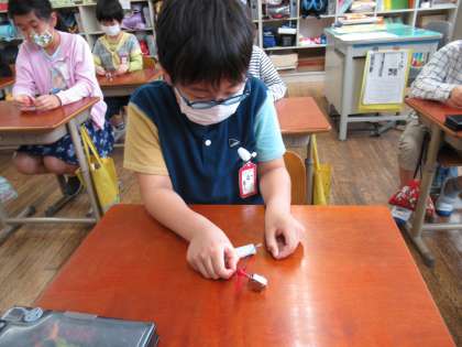 その後,モーターを回転させて送風機を作りました。たっぷりと実験するなかで,プロペラの回る向きが個人個人で違うことに気づきました。「なんで?」という声をもとに,その理由をみんなで探っていきます。