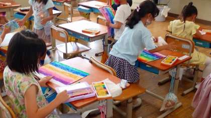 今日は,図工の時間に初めてクレパスを使いました。好きな色で細い線や太線を描いたり,線の隙間を塗りつぶしたりしながら,クレパスの使い方を学びました。仕上がった作品は,たくさんの色で塗られた虹になりました。
