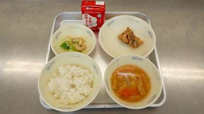 「いわしのこはくあげ」に使われている「あじ」は,春から夏にかけて脂がのっておいしくなります。体をつくるたんぱく質や,骨や歯をつくるカルシウムが多く含まれています。今日のこはくあげは,からっと揚がったサクサクの衣とぷりっとした身の食感を楽しみながらいただきました。