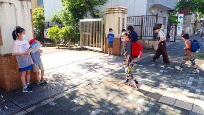 今日は,たてわりあいさつ運動の日です。日差しが照りつける暑い時間でしたが,朝から元気よくあいさつに取り組みました。