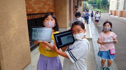 GIGA端末の写真機能をしっかり使いこなしていますね。この後,教室でそれぞれの生長の様子についてGIGA端末を使って交流することができました。