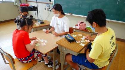 高学年は,順序を意識する絵本の読み聞かせを聞いたあとに,「はじめに」「つぎに」などの表現を使いながらカードを並び替える学習をしていました。